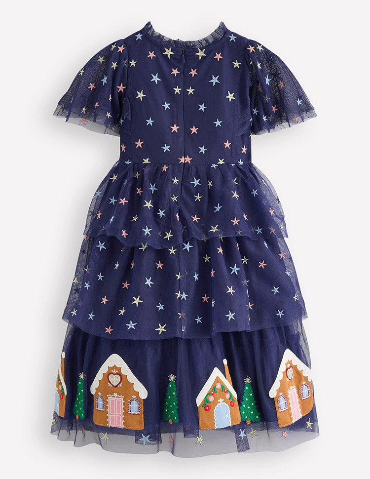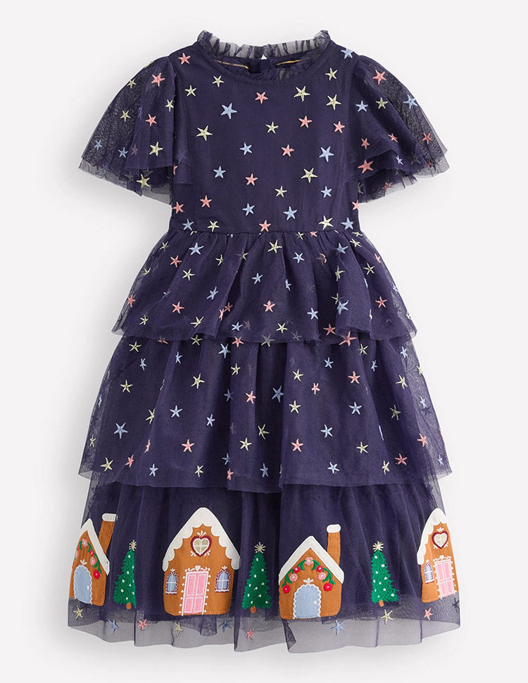 • Minis will go all starry eyed over this night-sky-inspired tulle dress. We've decorated it with gingerbread houses along the hem so with every twirl little ones can imagine sprinkling sugar and spice around the room.